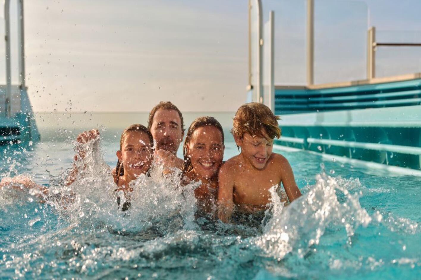 - Wasser-Erlebniswelten, Pools, Klettergarten, Boulder-Wand, Game Center (je nach Schiff)